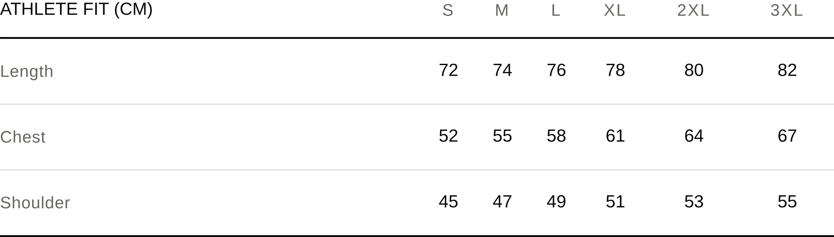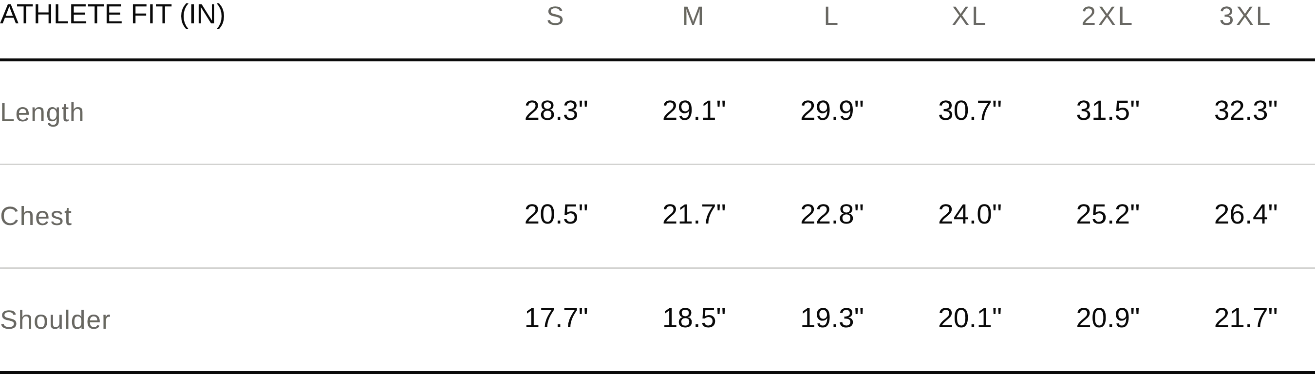 Athletic fit — comfortable through the chest and shoulders, tapered through the body.